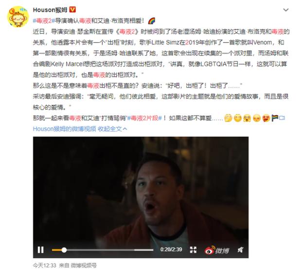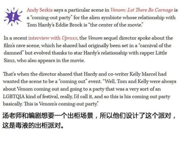 根据媒体采访透露,《毒液2》的导演曾公开表示,这部电影中会有“出柜派对”的场景,这也意味着毒液和男主会有爱情的关系,而且导演也明确表示这份爱情会是这部电影的核心感情线。