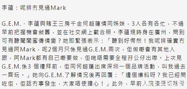 于是港媒联系上邓紫棋的闺蜜李蕴,对方听到邓紫棋分手传言非常紧张,表示这段时间没看到Mark,近两个月只见过邓紫棋两次,三周前她跟何超莲一起出席活动。